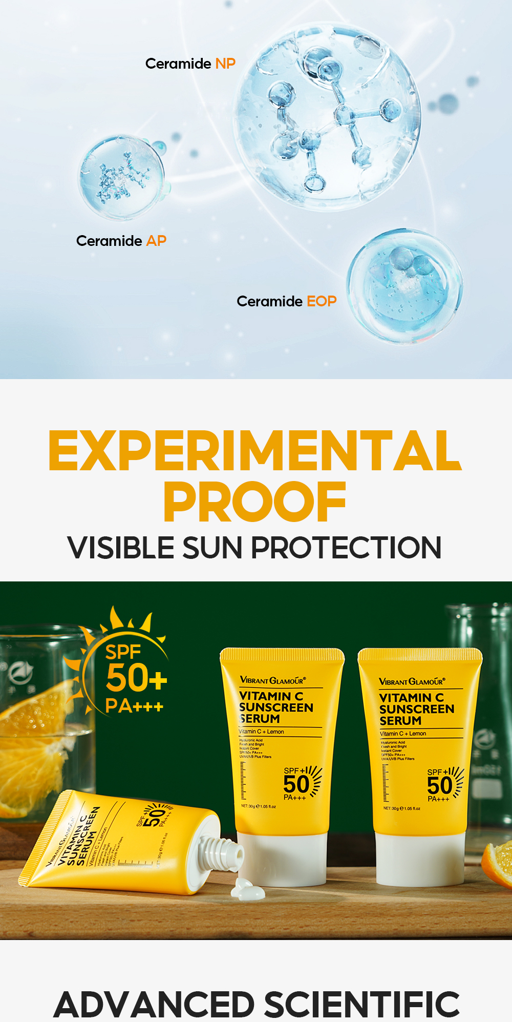 VIBRANT GLAMOUR Vitamin C Sunscreen Serum SPF 50+ PA+++ UVA/UVB Sunblock 50X C 3X Ceramide Repair Skin Moisturizing 30g