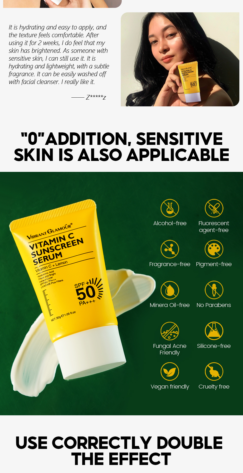 VIBRANT GLAMOUR Vitamin C Sunscreen Serum has been allergy and sensitization tested and is a non-irritating, hypoallergenic formula.