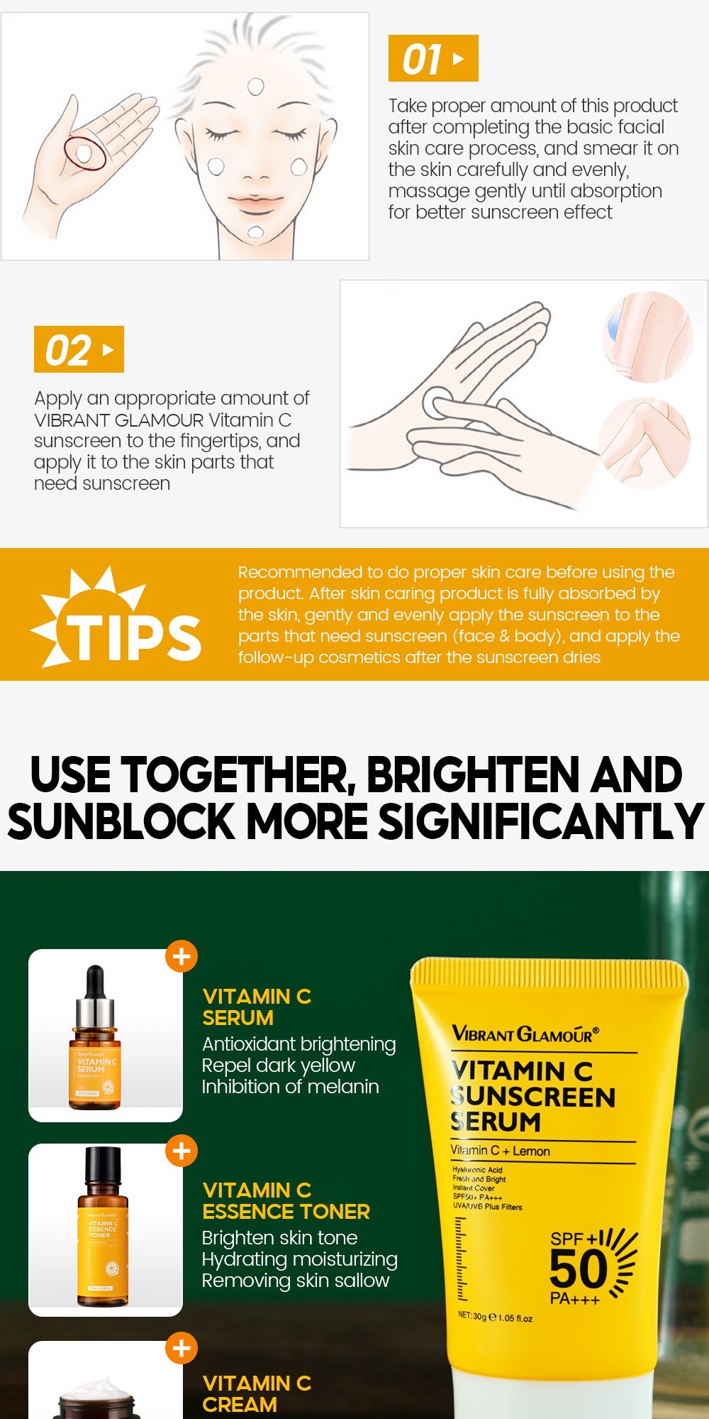 The brand new VIBRANT GLAMOUR Brightening Full Effect Super UV SPF 50+/PA+++ Sunscreen is enriched with vitamin C and sunscreen technology, containing a variety of botanical beauty ingredients. Its ultra-lightweight texture ensures that the skin is not greasy or sticky, providing even coverage for every inch of the skin. It thoroughly protects your skin and is suitable for Asian skin.